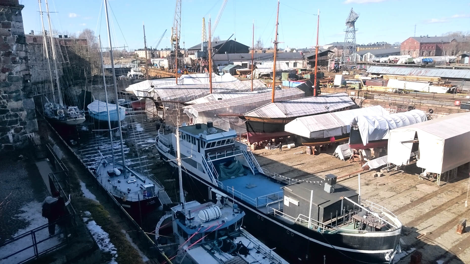 L'île de Suomenlinna comporte aujourd'hui un chantier naval spécialisé dans la restauration de vieux bâteaux d'époque.